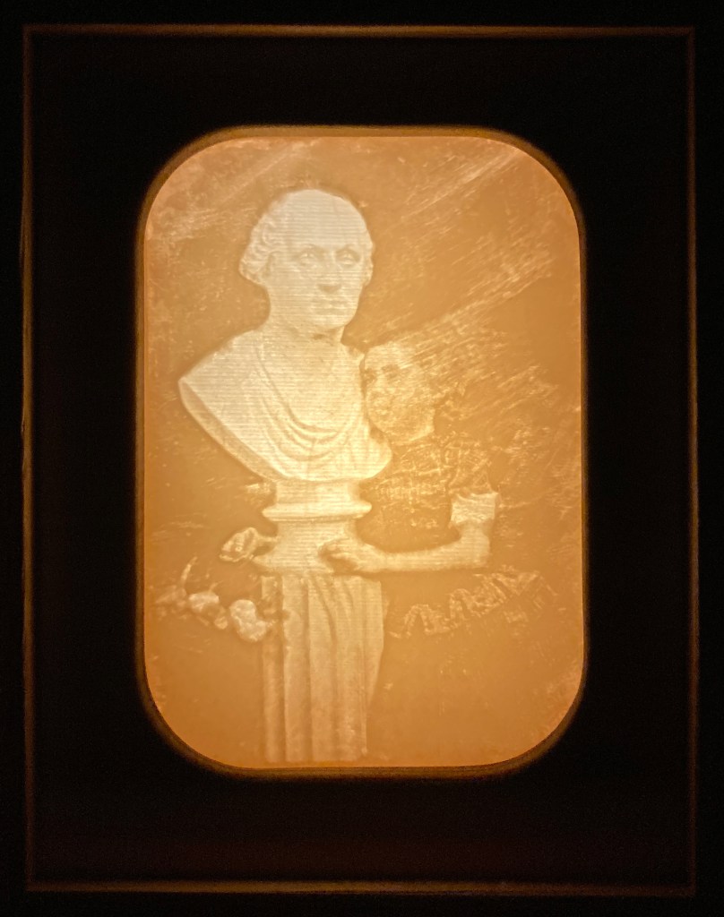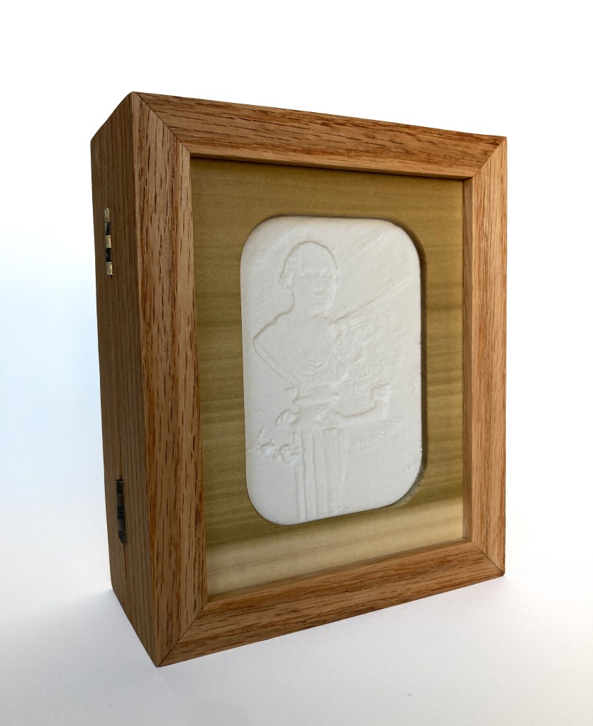 This body of work began with an image – a circa 1850s daguerreotype depicting a little girl embracing a bust of George Washington. She was the daughter of the photographer, who had already produced a similar composition featuring his son1. The image depicts three-year-old Helia who rests her cheek on Washington’s marble chest and looks beyond him out of frame, her duty performed in a plaid dress, delicately holding a basket of flowers. The performance of gender evidenced in this 19th century image struck me deeply, reverberating off my own sense of gender trouble, and created a longing to commune with Helia. I began writing to her, asking unanswerable questions such as, “Did you like that dress you wore?”