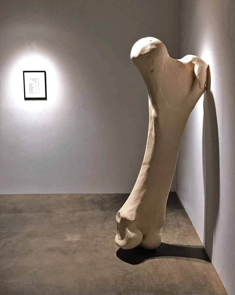 Jefferson's Bone CNC routed foam, house paint, doctored book page (from Notes on the State of Virginia, 1785)6’2″ tall2019